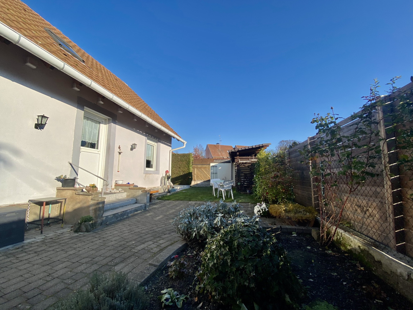 Les extérieurs sont composés d'une cour d'entrée, d'un petit terrain engazonné, d'un abris à vélos, d'un abris à matériel de jardin, de deux parkings privatifs sécurisés par un portail.